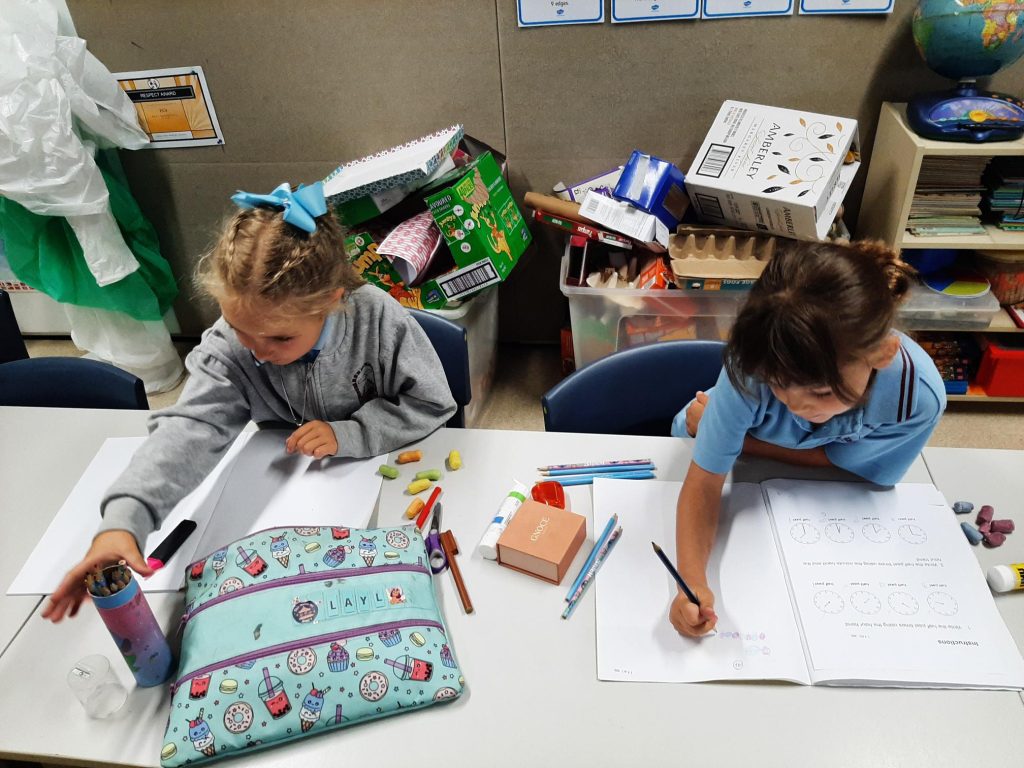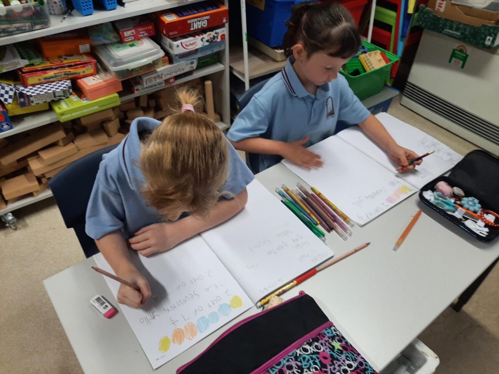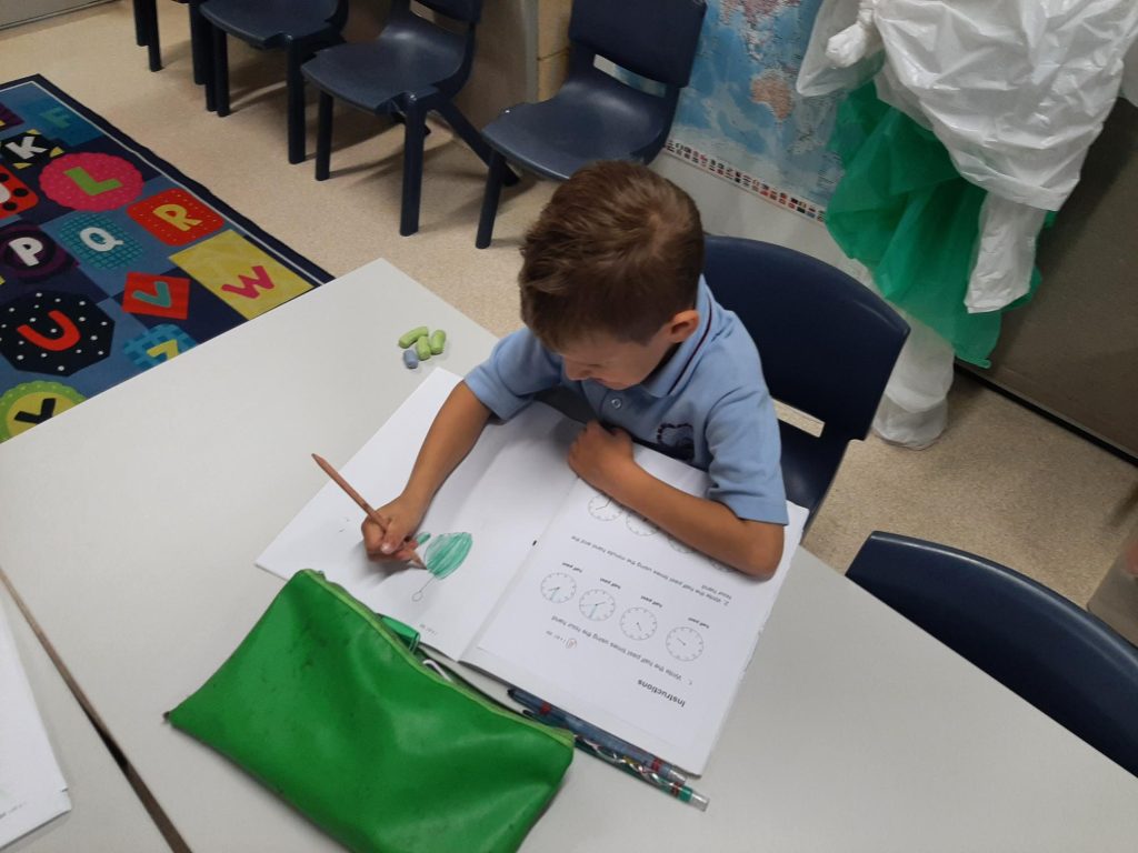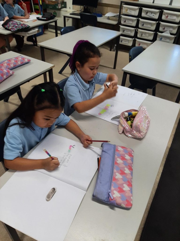 Students in EC4 had to make and then draw a caterpillar with different colours. Then the students wrote down the ‘out of’ statement, i.e. 3 out of 5 are yellow, the fraction 3/5 and write three fifths, 2 out of 5 are blue, fraction 2/5 and write two fifths. Extended students had a longer caterpillar.