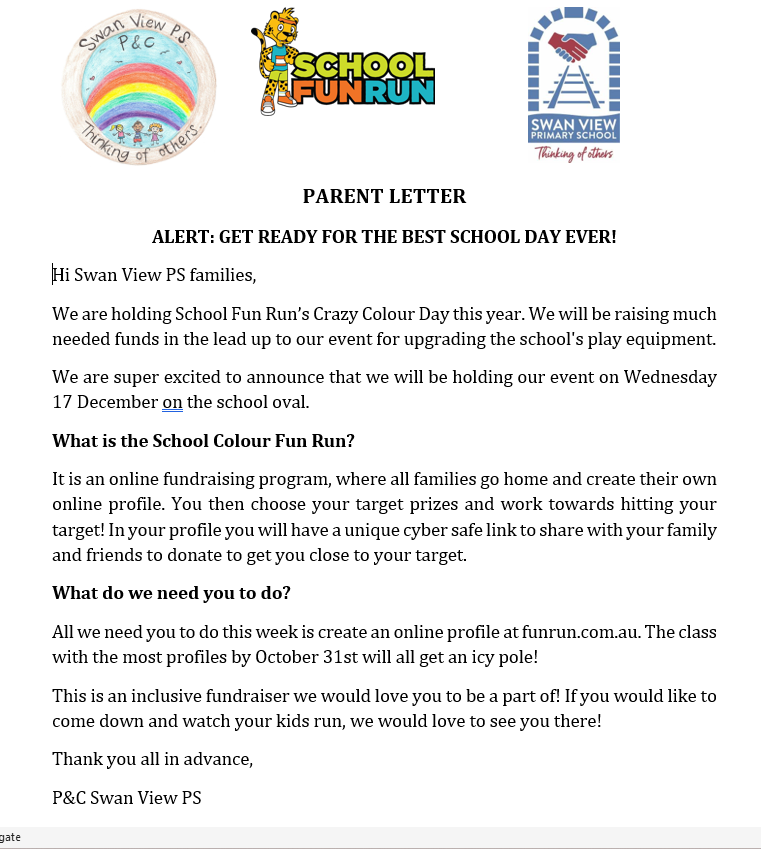 The P&C have organised this again for WEDNESDAY 17th December. Students will get their sign up forms and get the chance to earn some great prizes with sponsorship.