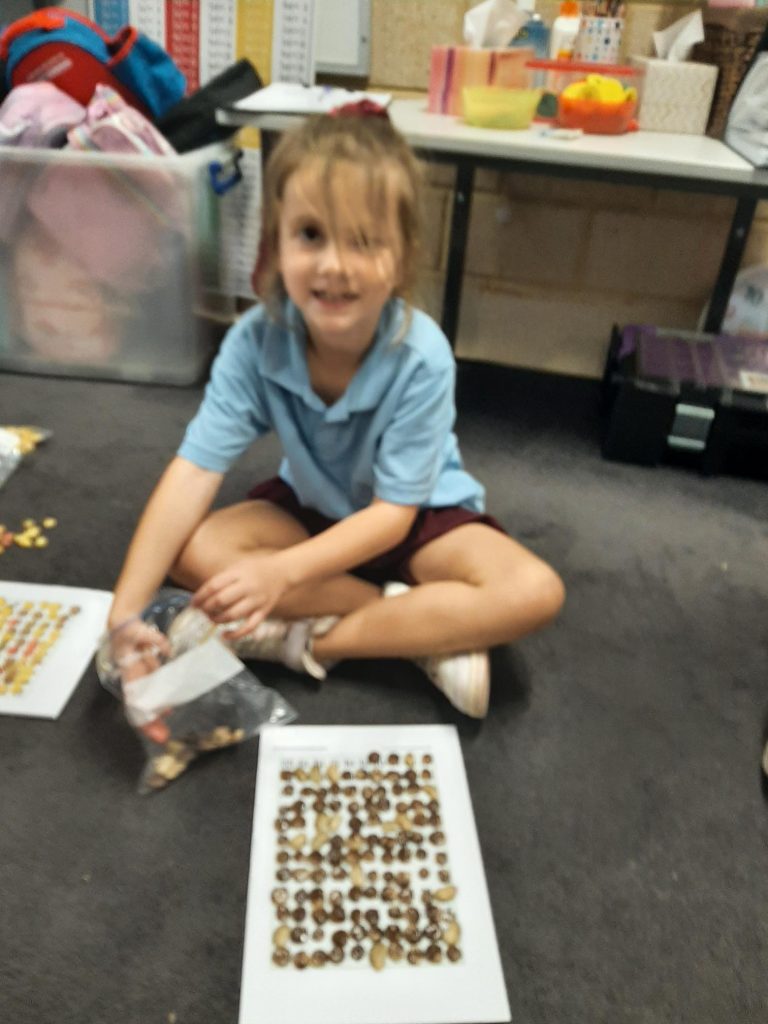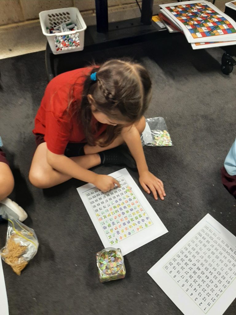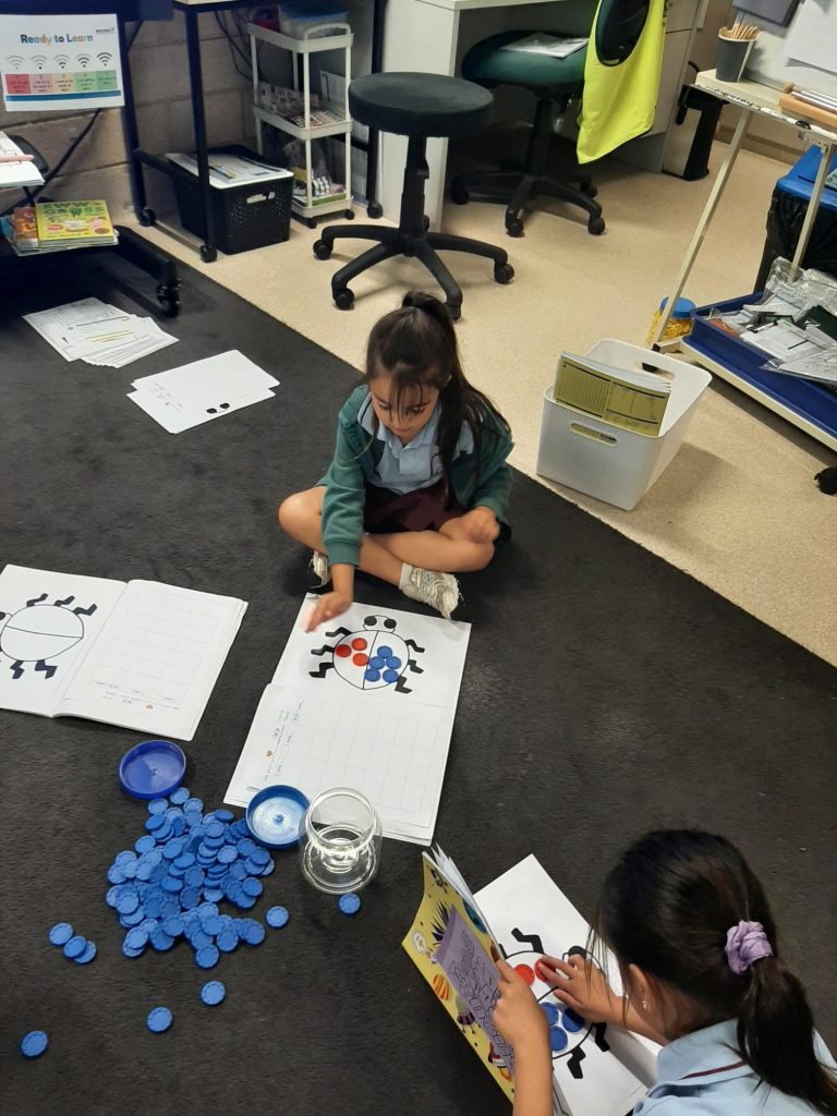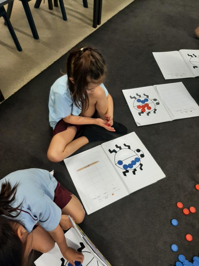 Students created ladybirds using counters on top of the templates, aiming to see the number of spots straight away (subitising small collections up to 10). Student A closes their eyes, student B makes the ladybird. Student A opens their eyes and tries to see the total, for example “I see 3 (circling around that side of the ladybird), I see 5 (circling around that side of the ladybird), that is 8 (circling around the whole ladybird).
