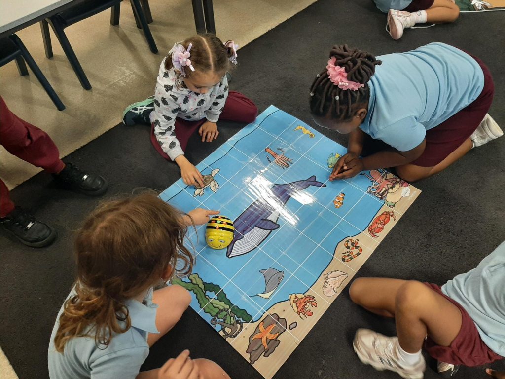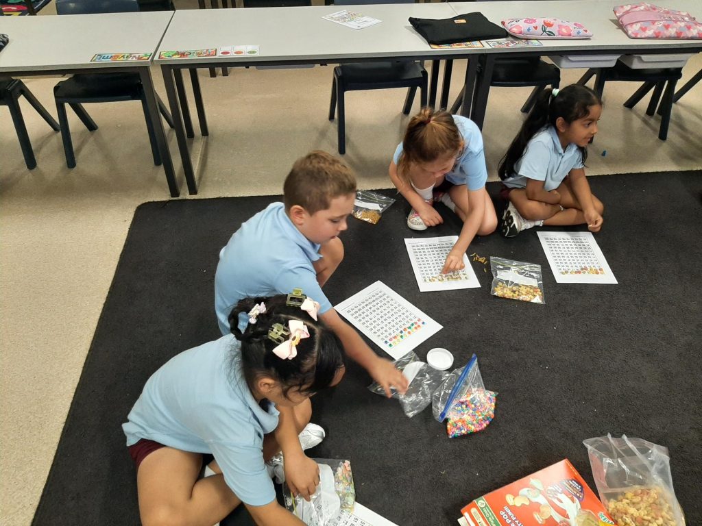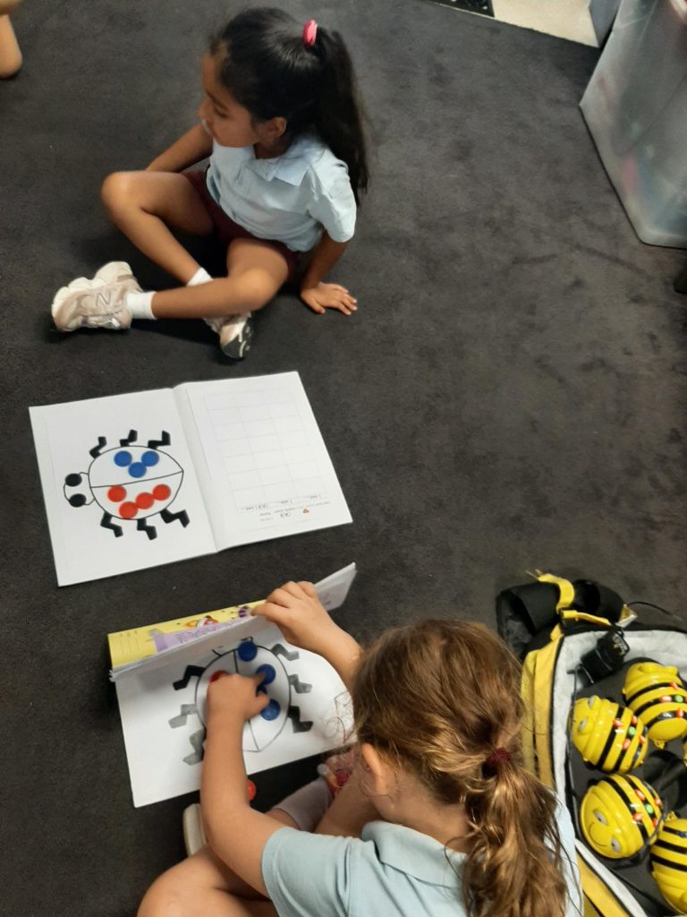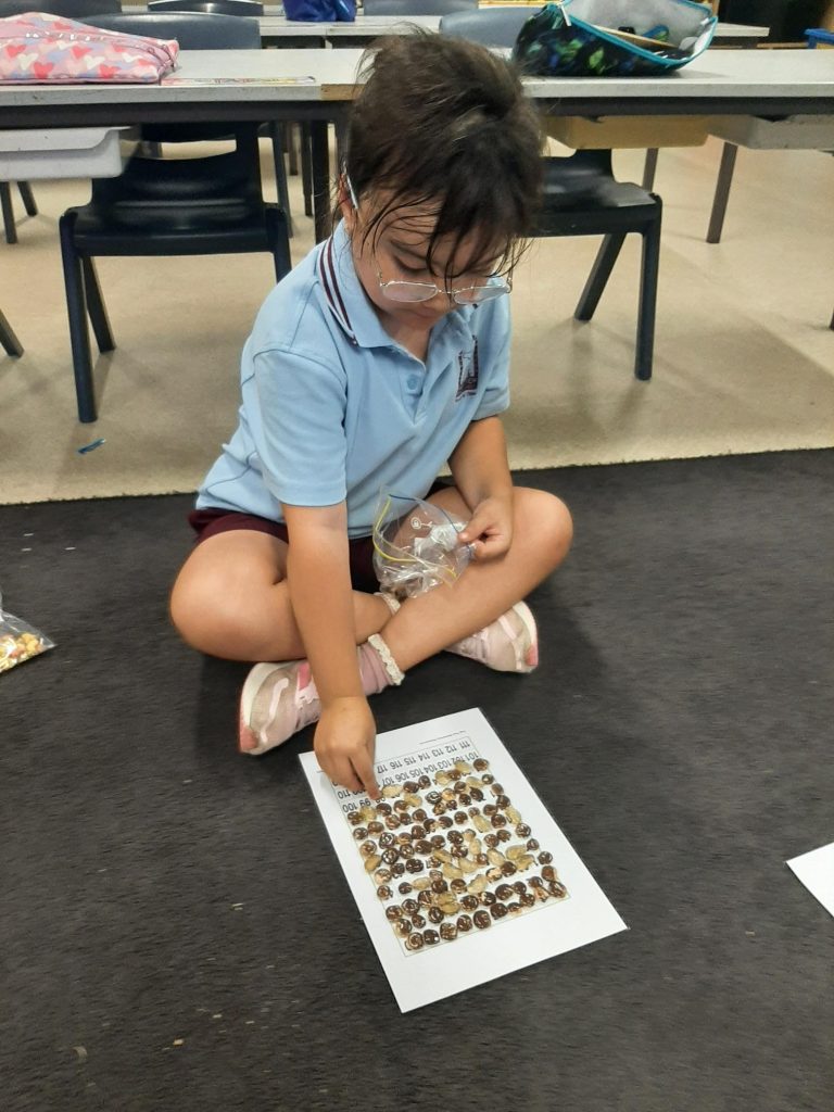 Students created ladybirds using counters on top of the templates, aiming to see the number of spots straight away (subitising small collections up to 10). Student A closes their eyes, student B makes the ladybird. Student A opens their eyes and tries to see the total, for example “I see 3 (circling around that side of the ladybird), I see 5 (circling around that side of the ladybird), that is 8 (circling around the whole ladybird).