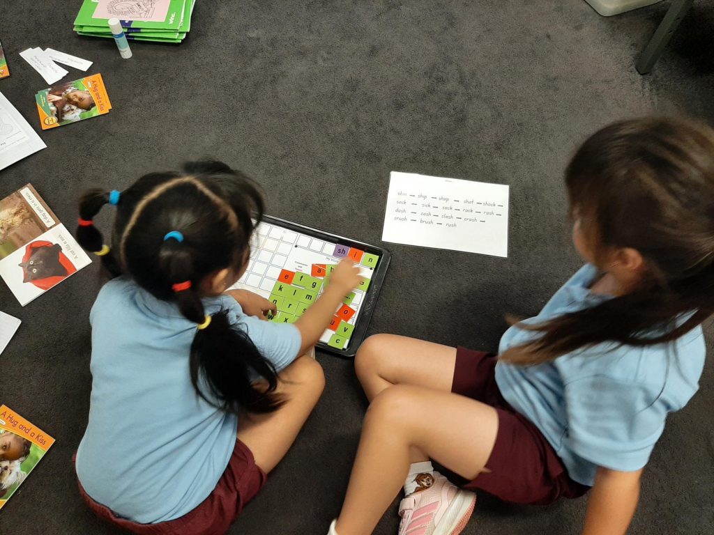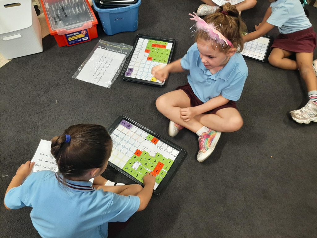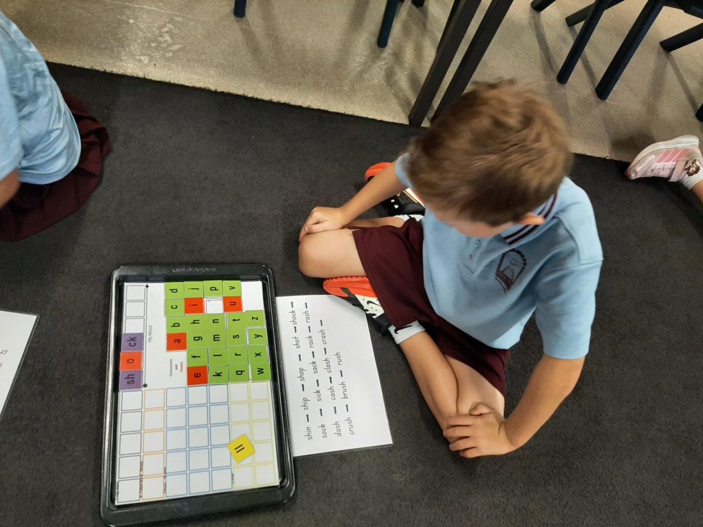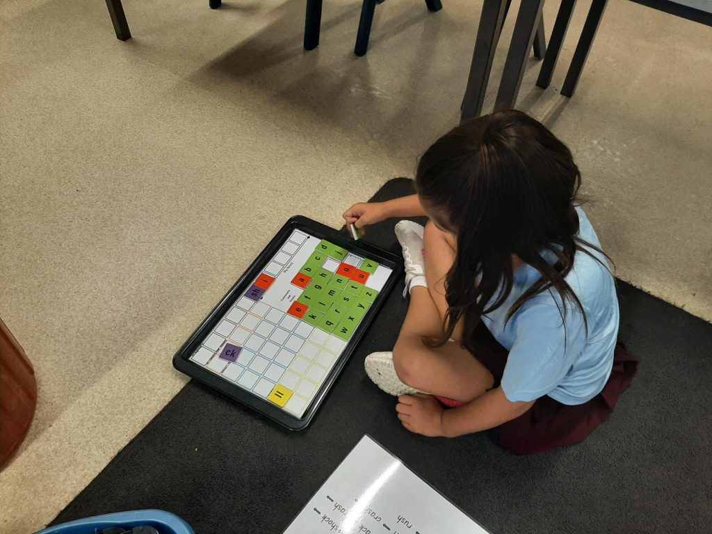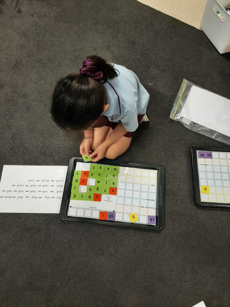 EC4 during Literacy rotations. Students were doing work word with manipulative tiles. This allow students to physically represent sounds and then move tiles as they say each sound in a word.