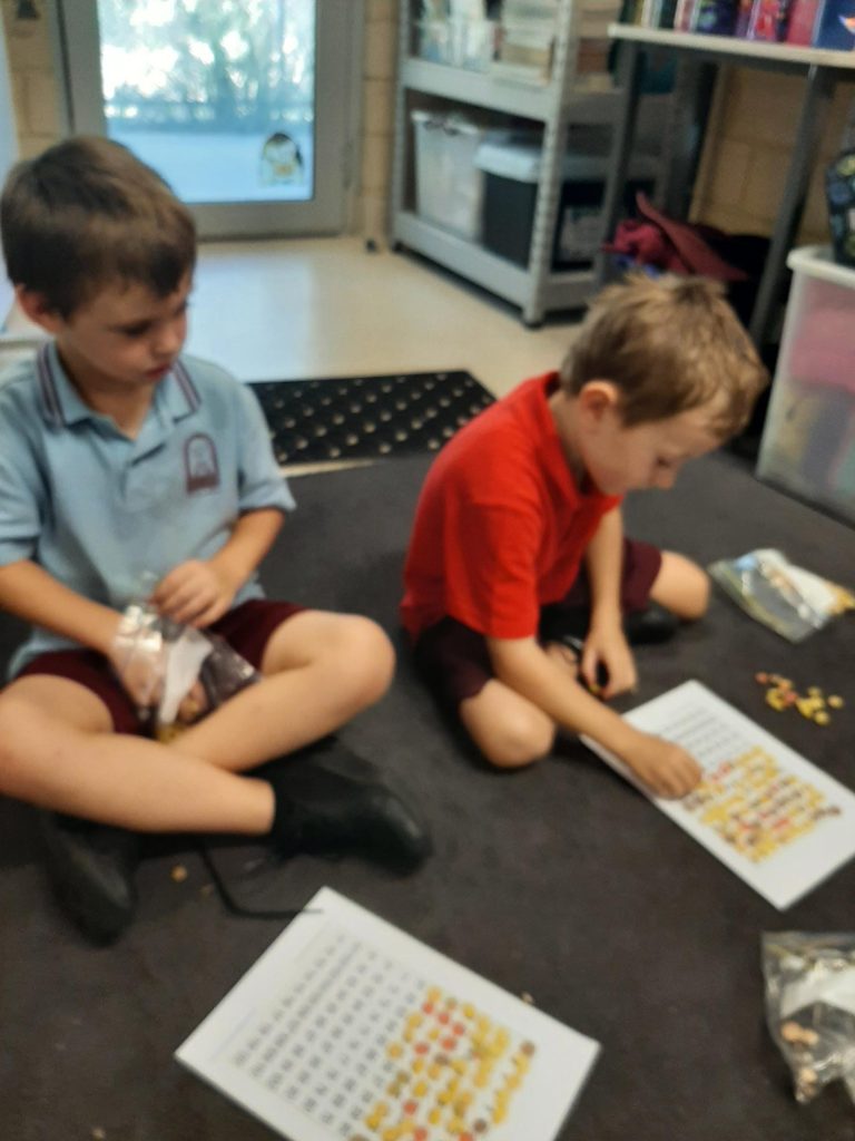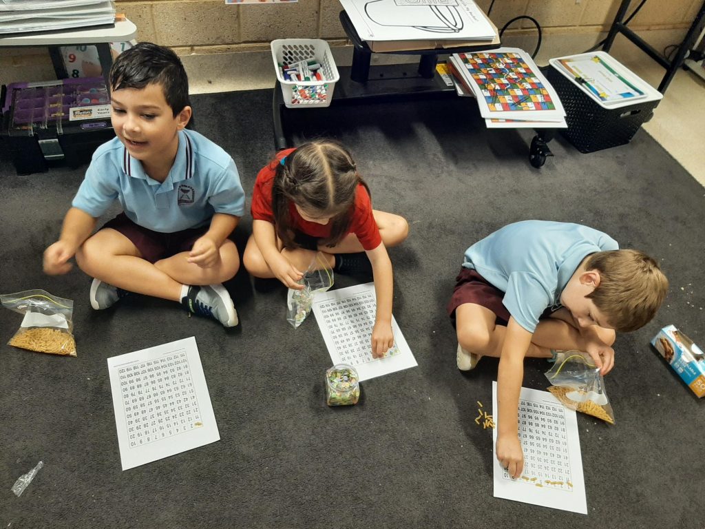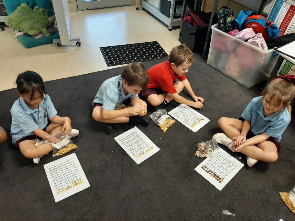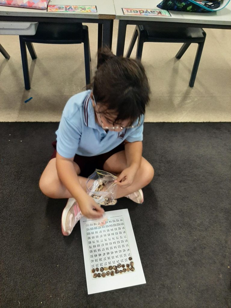 Students (extension) made 100-120 other students made 20-50 things bags and check the count of their classmates. The bags are then changed in quantity, so that each bag does not necessarily contain precisely 100. Students now need to estimate and check the count of each bag by laying the items onto squares of the 120 chart.